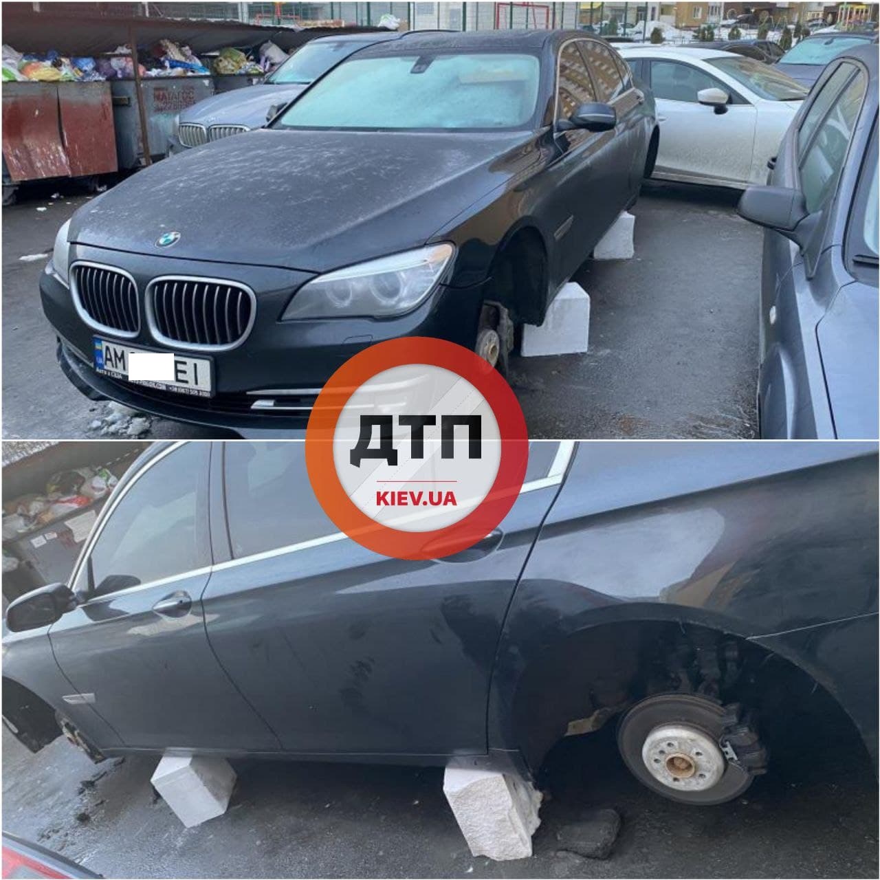 "Вот таковое не доброе утро в Киеве - BMW за ночь лишился четырех колес", - говорится в подписи к фото.