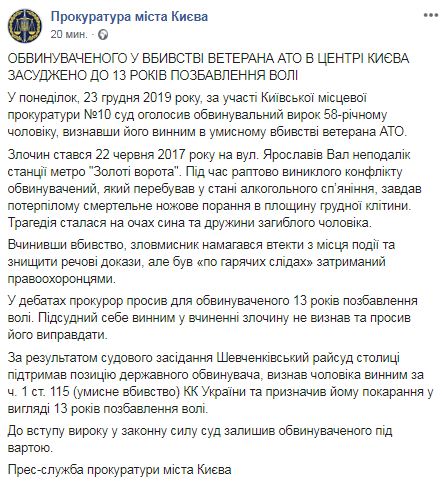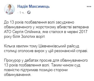 "До 13 лет лишения свободы осуждено обвиняемого в жестоком убийстве ветерана АТО Сергея Олейника, которое произошло в июне 2017 у Золотых ворот. Несколько минут назад Шевченковский райсуд столицы вынес приговор по этому резонансному делу. Прокурор в прениях просил для обвиняемого 13 лет лишения свободы . Таким образом, суд полностью поддержал позицию стороны обвинения", - говорится в сообщении.