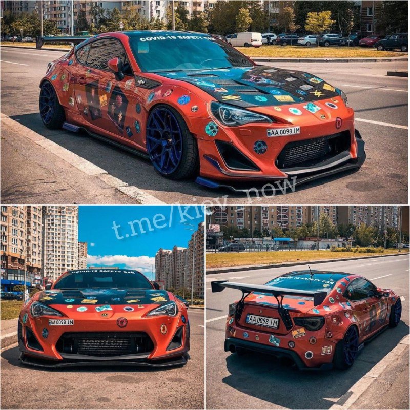 Машину марки Toyota GT86 обклеили наклейками с изображением коронавируса COVID-19. На лобовом стекле видна надпись: "COVID-19 Safety Car". Также весь кузов авто красочно об этом говорит.