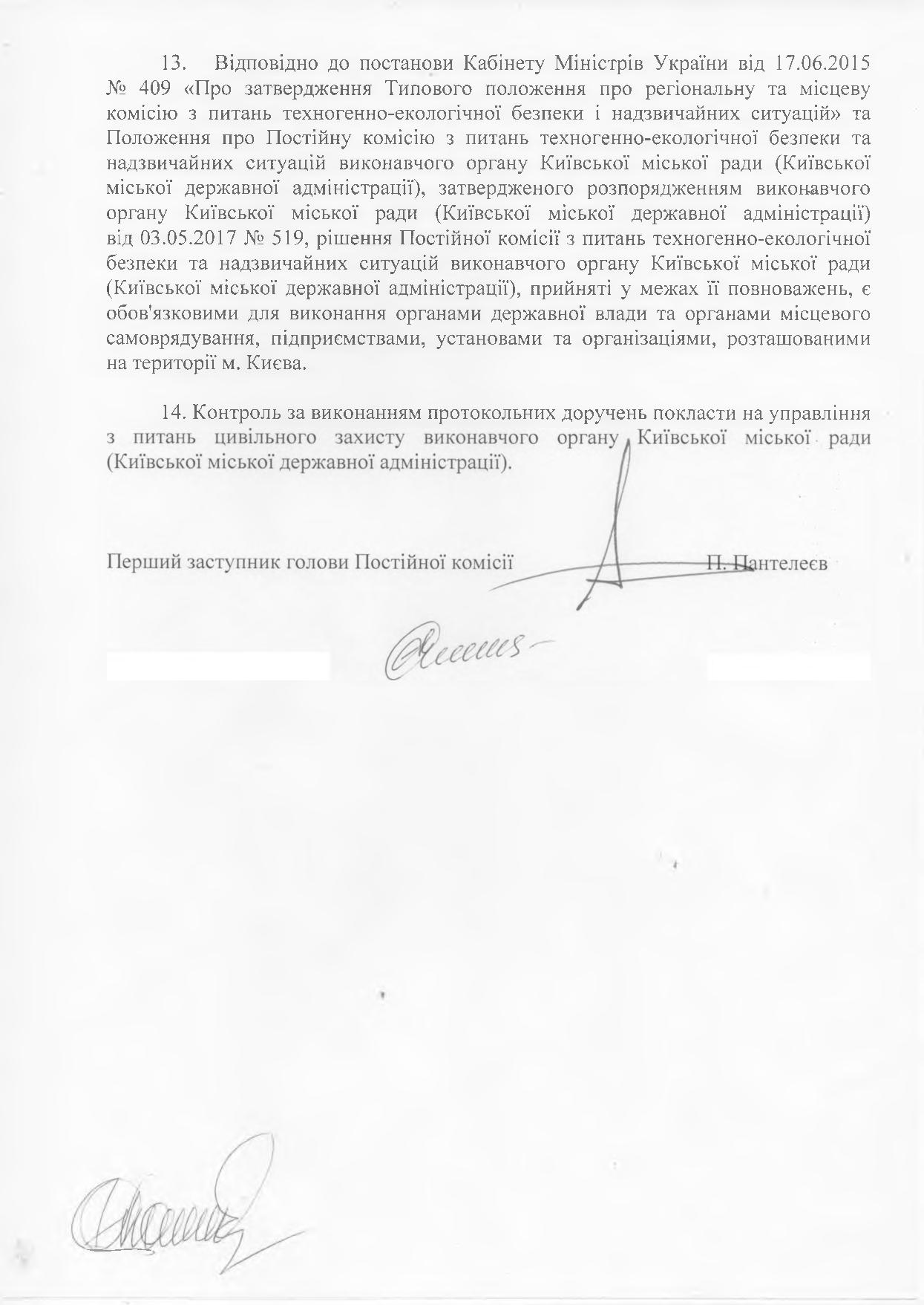 Согласно с действующим законодательством и нормативными актами решение Постоянной комиссии по вопросам техногенно-экологической безопасности и чрезвычайных ситуаций КГГА является обязательным для выполнения всеми субъектами хозяйствования, расположенными на территории города Киева.