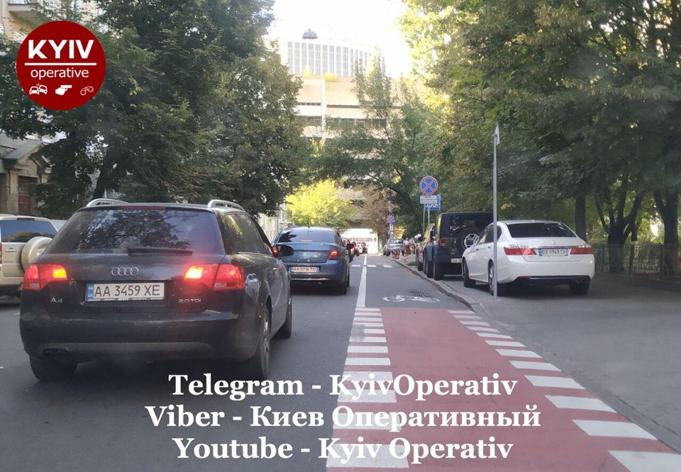 Водительница автомобиля Skoda попыталась объехать затор, который образовался на улице Рейтарской в украинской столице, по велосипедной дорожке, и пробила сразу два колеса.