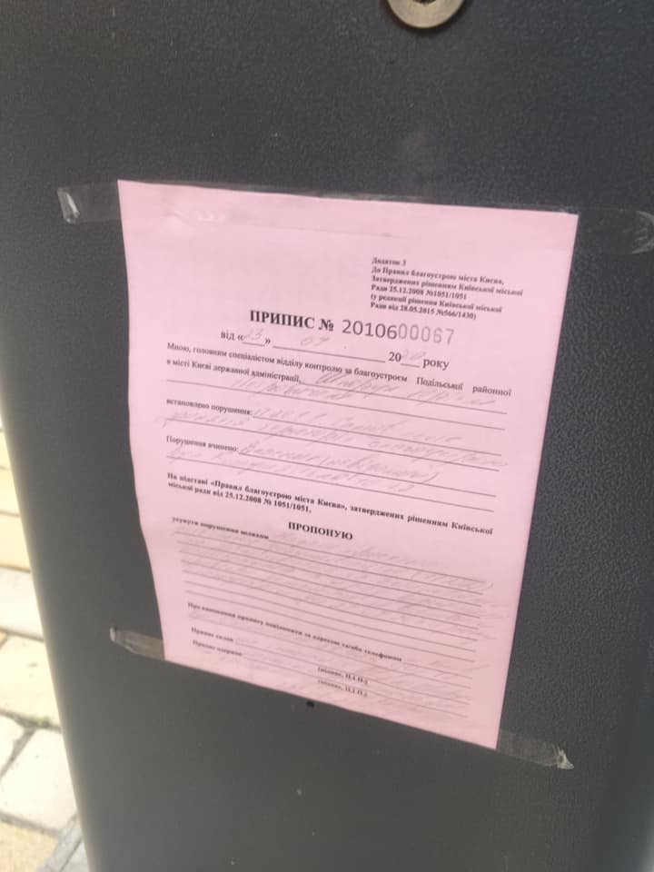 "Коммунальное предприятие "Киевблагоустройство" вчера вынесло предписание, довольно оперативно, на следующий день после обращения! Ждем развитие событий, насколько такие действия законны! Местных это тоже возмутило. Не только меня", - написал Рыбачук.