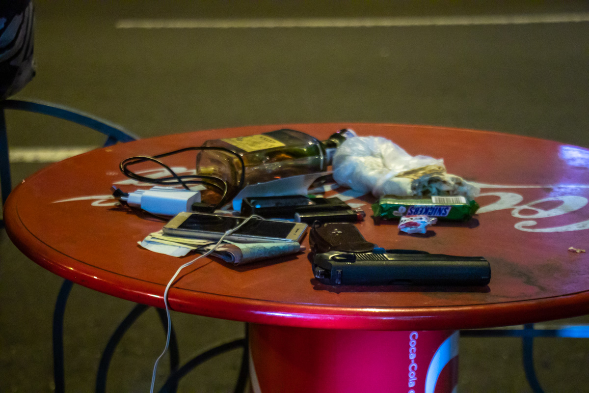 Происшествие случилось около 23:00. По словам парней, мужчина с бутылкой коньяка, которую он распивал "с горла" вышел из заведения "Big mama" и начал приставать к их подруге. Компания сделала ему замечание, но тот в свою очередь сначала начал махать руками, после чего достал из куртки пистолет и пытался приставить его к голове одного из парней. Ребята выхватили у мужчины из рук оружие и схватили его.