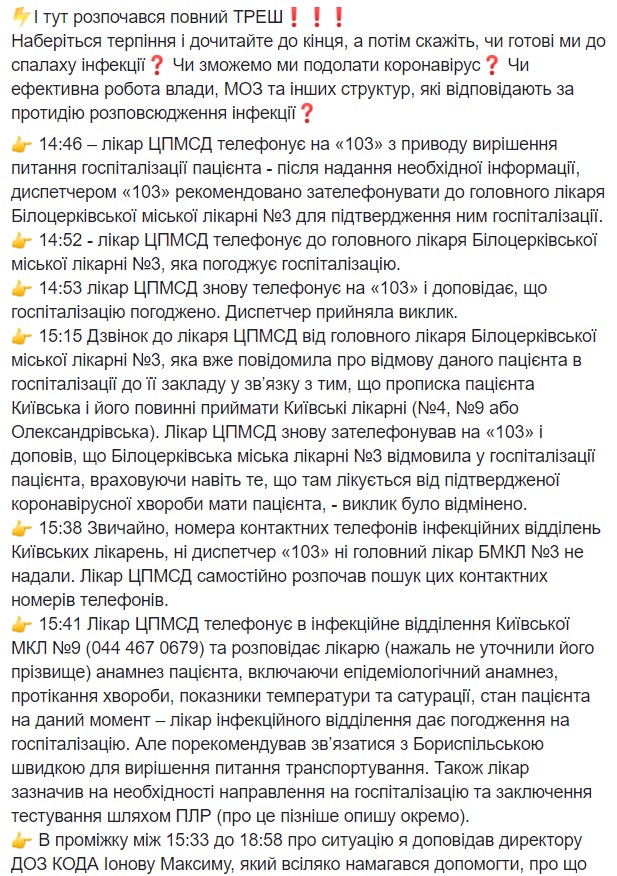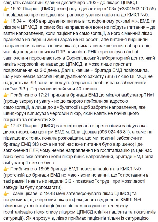 "И самое интересное - в 19:48 мне позвонила врач ЦПМСД и сообщила, что дежурный врач инфекционного отделения КГКБ №9 отказал в госпитализации (хотя он сам согласовал по телефону госпитализацию после описания врачом ЦПМСД клиники пациента и показателей сатурации). Как я понял, врач принимает пациентов только с сатурацией менее 92 (хотя по приказу №722 менее 93)", - написал Черенок.