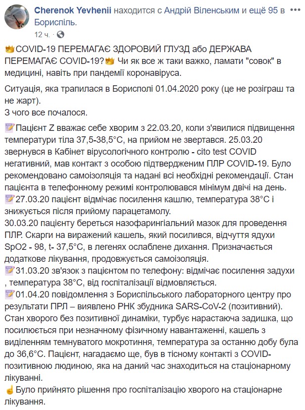 Об этом в Facebook сообщил директор Бориспольского городского центра первичной медико-санитарной помощи Евгений Черенок.
