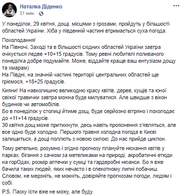 Об этом написала синоптик Наталка Диденко в Facebook.