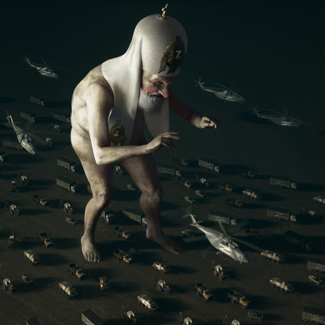 Подобно прежним персонажам картин Прокопенко – Путину и Лукашенко – российский патриарх выглядит гигантским монстром. На непропорционально тонких ногах он движется среди военной техники РФ, простирая над ней руки для благословения.