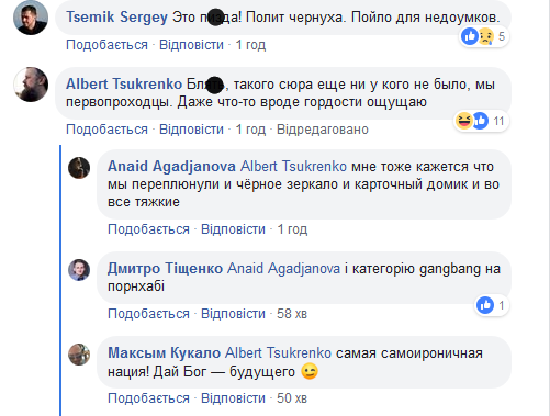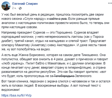 "А есть еще Жанна Борисенко, которая на самом деле Тимошенко. Она популистка, обещает все снизить в 4 раза, думает о прическах и говорит "любі українці". Пилит бабло с Маматовым, и с другими олигархами. В конце печатает кучу денег, ввергает страну в гиперинфляцию, а страна разваливается на десятки республик. Это как бы говорит зрителю: "вот что будет, коль проголосуешь не за ̶Г̶о̶л̶о̶б̶о̶р̶о̶д̶ь̶к̶о̶ Зеленского", - написал Спирин.