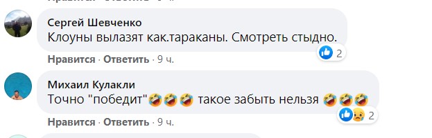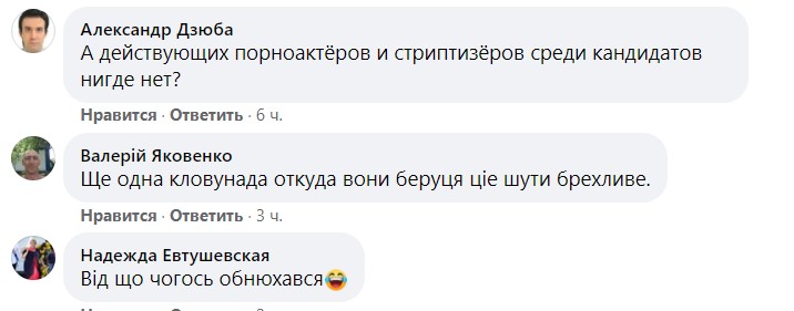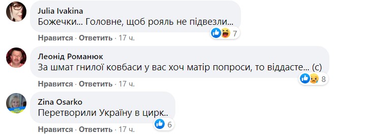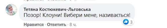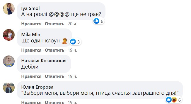 "Клоуны вылазят как тараканы. Смотреть стыдно", "Позор! Клоуни! Вибери мене, називається!", "Выбери меня, выбери меня, птица счастья завтрашнего дня", "Превратили Украину в цирк", "Хлеба нет и не будет нации, но зрелище головное", - пишут они.