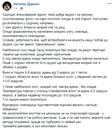 "Сегодня атмосферный фронт, который хорошо видно и на свежем спутниковом фото и на карте текущей погоды во всей Европе, постепенно двигаться в восточном направлении. В зоне фронта будет идти мокрый снег и дождь. Осадки будет формировать налипание мокрого снега, гололед, усиливать гололед. Словом, делать все, чтобы испытать на прочность нашу любовь к декабрю и к так называемой "европейской зиме", - написала метеоролог.