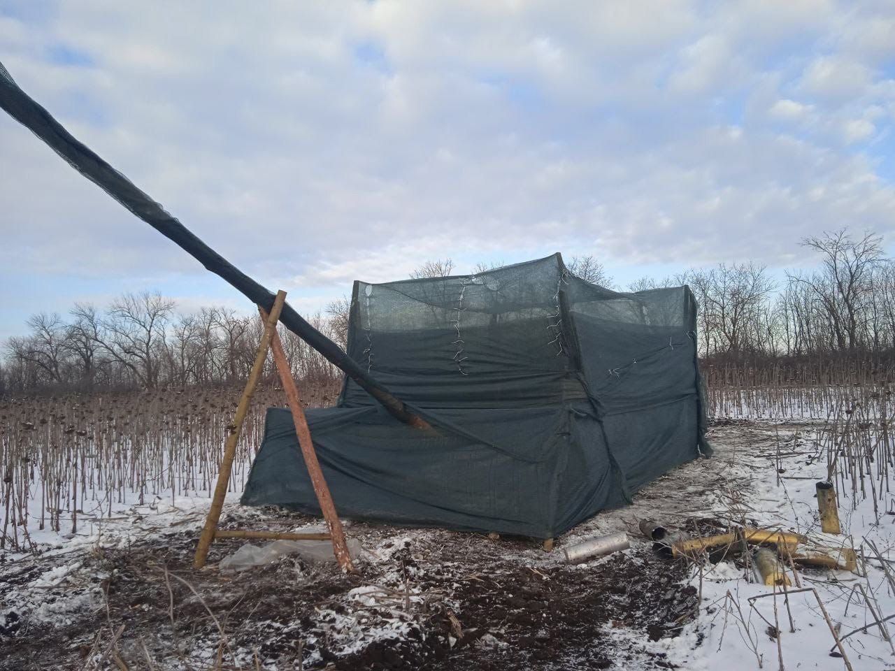 Он добавил фото "бронемашины" из палок, которые оккупанты обтянули зеленой сеткой. Для правдоподобия они даже разложили рядом гильзы от снарядов.