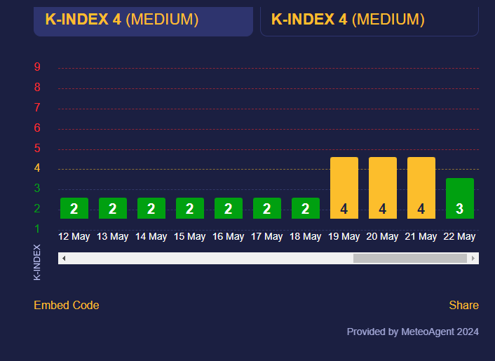 С понедельника, 22 апреля, по субботу, 27 апреля, на Земле продолжается мощная магнитная буря. 25 апреля ее сила снизится до К-индекса 4 (желтый уровень). В мае магнитные бури средней интенсивности ожидаются 19-21 числа.