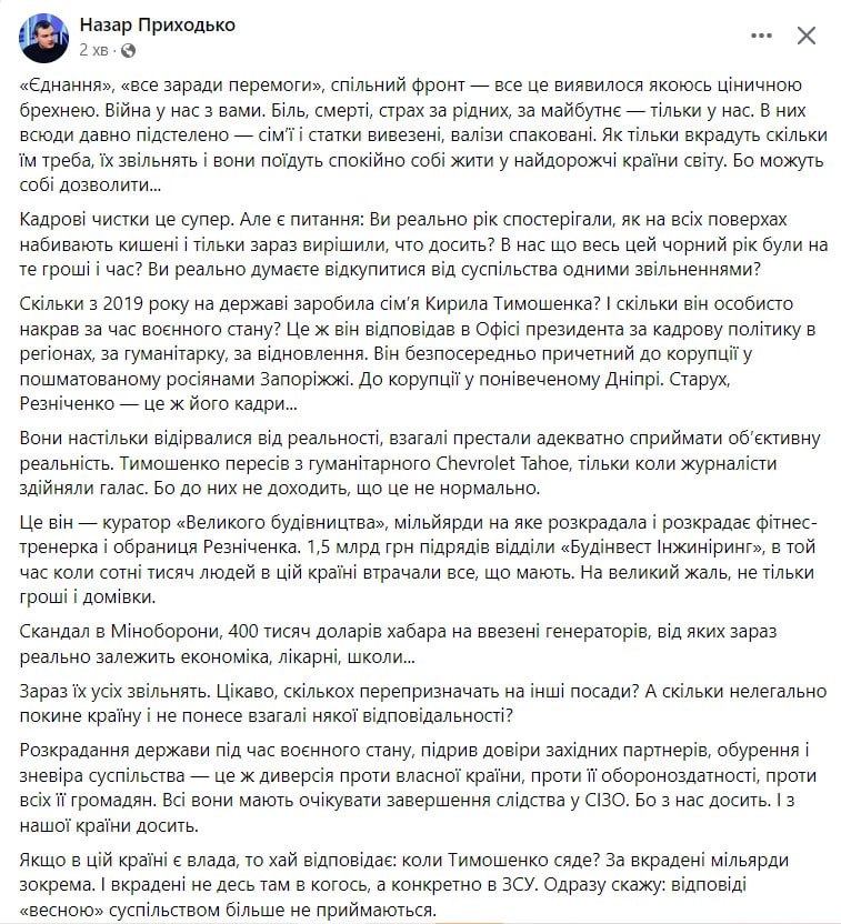В сети люди требуют от Специализированной антикоррупционной прокуратуры, Национального антикоррупционного бюро, Службы безопасности и Государственного бюро расследований привлечь к ответственности Кирилла Тимошенко.