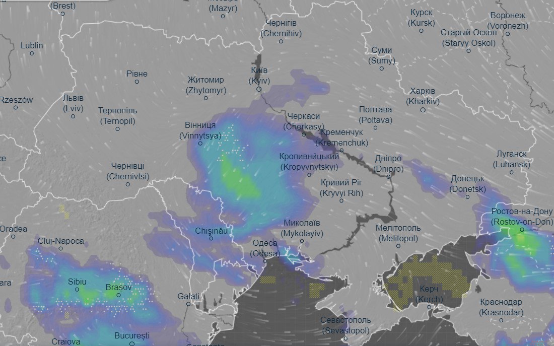 Днем оно уменьшится в размерах, в основном оставшись в Винницкой области, но его "филиалы" еще будут напоминать о непогоде в Николаевской и Донецкой областях.