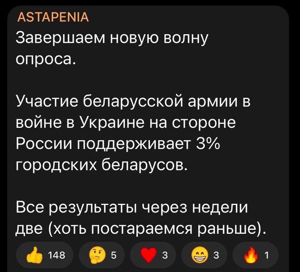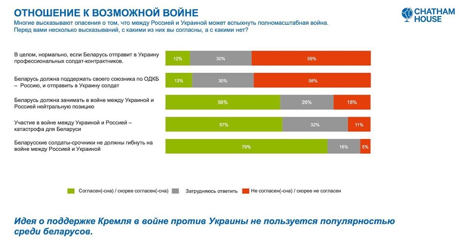 По данным предыдущего опроса, проведенного с 20 января по 8 февраля, 13% белорусов были за участие РБ в войне в Украине. Исследование проводила компания "Chatham house".