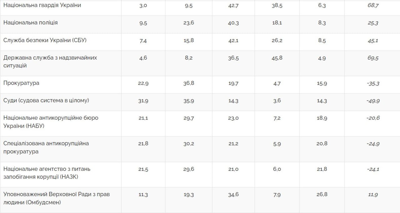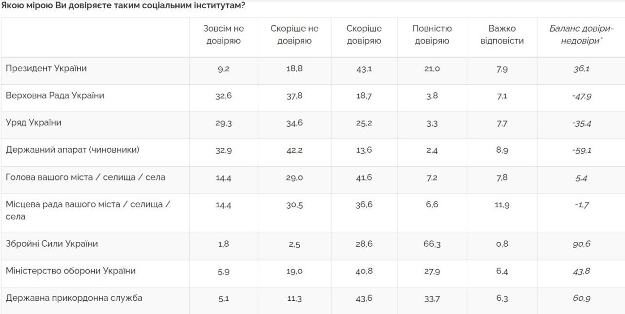 Большинство респондентов выражают недоверие государственному аппарату (чиновникам) (не доверяют 75%), политическим партиям (72%), Верховной Раде Украины (70%), судам (судебной системе в целом) (68%), правительству (64%), прокуратуре (60%), коммерческим банкам (53%), Специализированной антикоррупционной прокуратуре (52%), Национальному агентству по предотвращению коррупции (51%), Национальному антикоррупционному бюро Украины (51%).