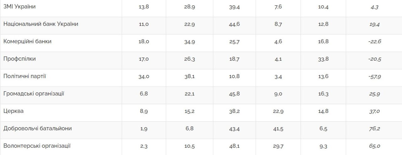 Кроме того, доверяют наши сограждане добровольческим отрядам (85%), ГСЧС (82%), Нацгвардии (81%), волонтерским организациям (78%), пограничной службе (77%), Министерству обороны (69%), Службе безопасности (68%), президенту Украины (64%), Церкви (61%), Нацполиции (58%), общественным организациям (55%), Нацбанку (53%).