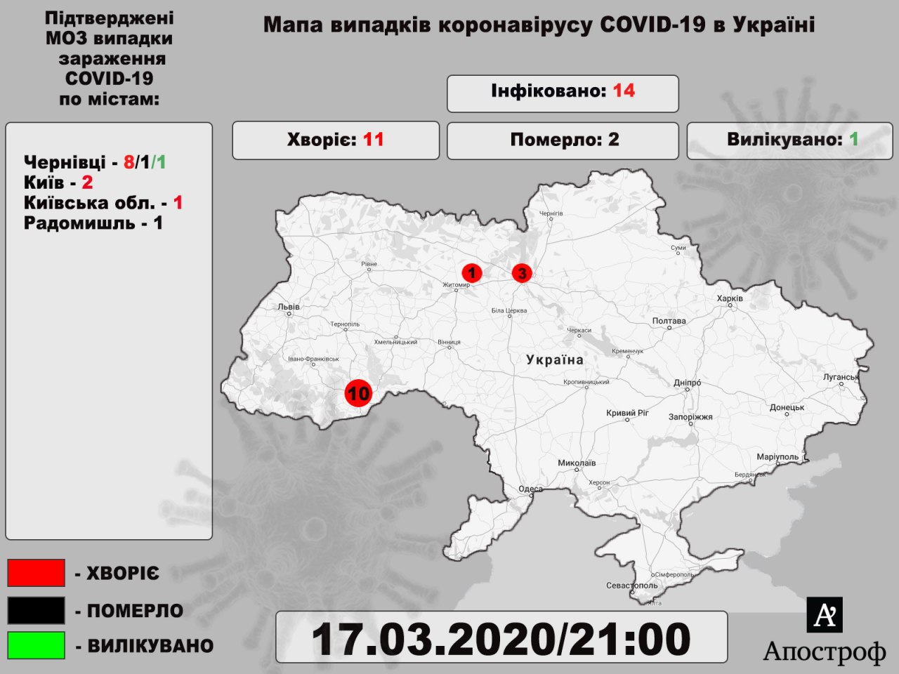По состоянию на вечер вторника, 17 марта, в Украине зафиксировали 14 случаев коронавируса, в трех областях Украины и Киеве, два из них оказались летальными, в том числе молодая женщина из Черновцов.