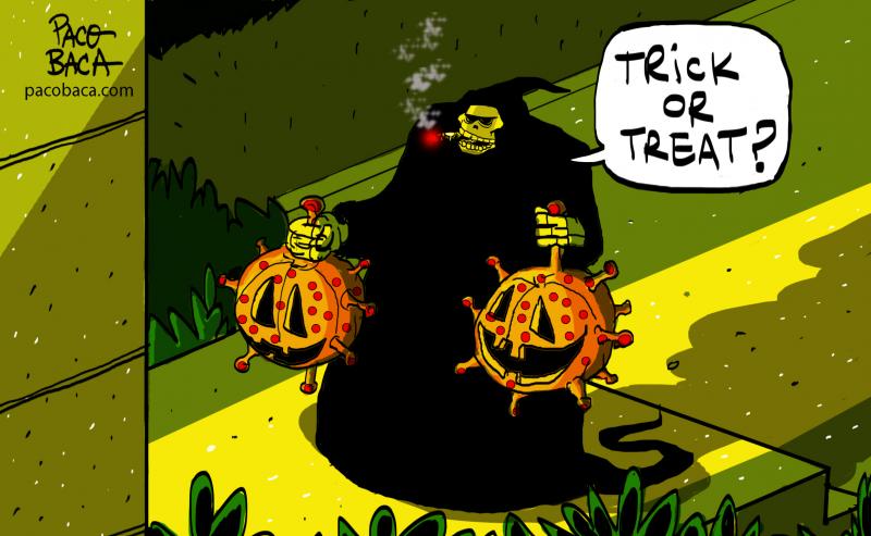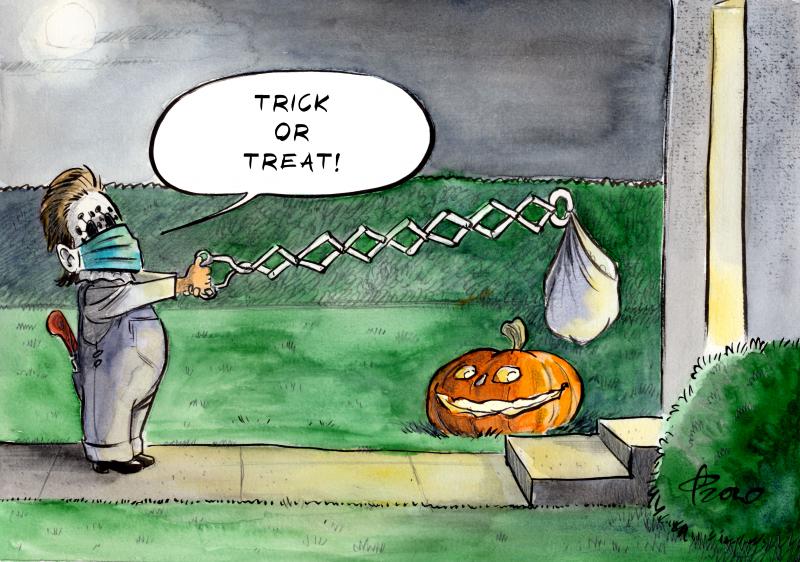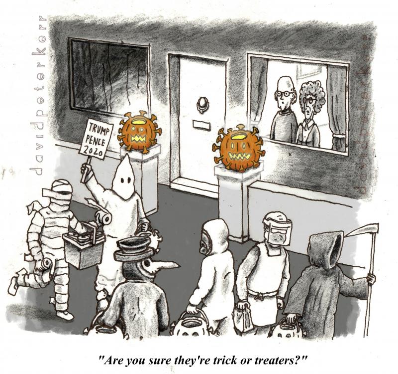 Кроме того, карикатуристы обыграли известную присказку, которую говорят на Хэллоуин: "Угости или обмани".