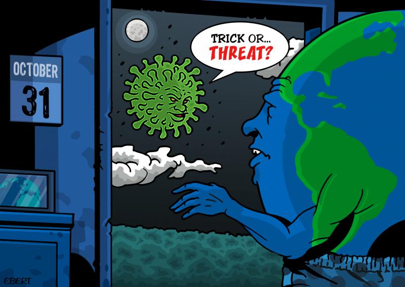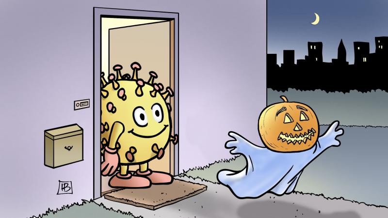 Авторы юмористических рисунков превращали праздничные тыквы в грозный коронавирус или изображали монстров убегающими от COVID-19. Не обошли своим вниманием и таких персонажей как Смерть и Чумной доктор.