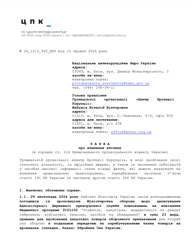 Глава правления Центра противодействия коррупции Виталий Шабунин обратился с заявлениями в правоохранительные органы относительно двух масштабных коррупционных схем, разоблаченных в 2024 году благодаря журналистским расследованиям. Речь идет о поставках на фронт неисправных мин и переплате 90 миллионов евро за оружие.