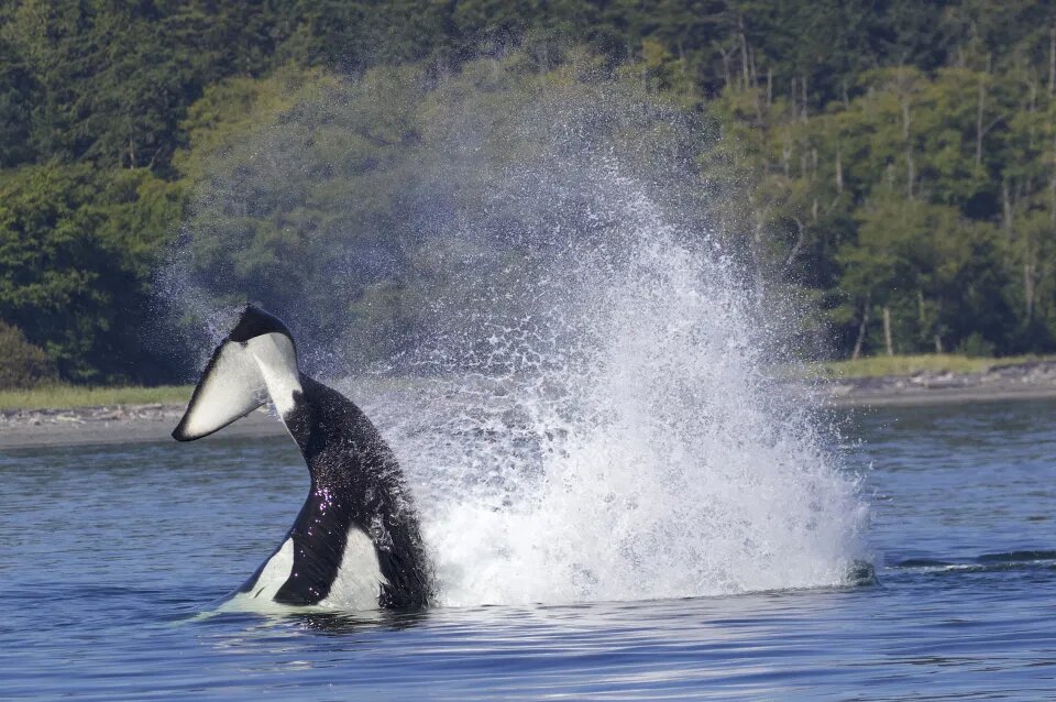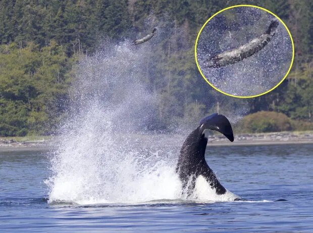 В Канаде моряк стал свидетелем удивительного зрелища: косатка ударила хвостом маленького тюленя, который из-за этого подлетел вверх на высоту 15 метров.