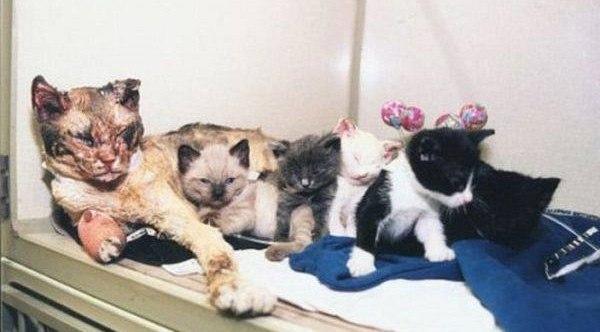 У кошки обгорела шерсть и глаза, однако она вывела всех своих котят.