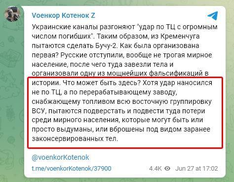 Российские пропагандистские СМИ также говорят о ракетном ударе по скоплению мирных людей, как об "очередной постановке украинцев типа Бучи". Говорят, что якобы удар наносился не по ТРЦ, а по нефтеперерабатывающему заводу, который снабжает топливом украинских военных на востоке Украины.