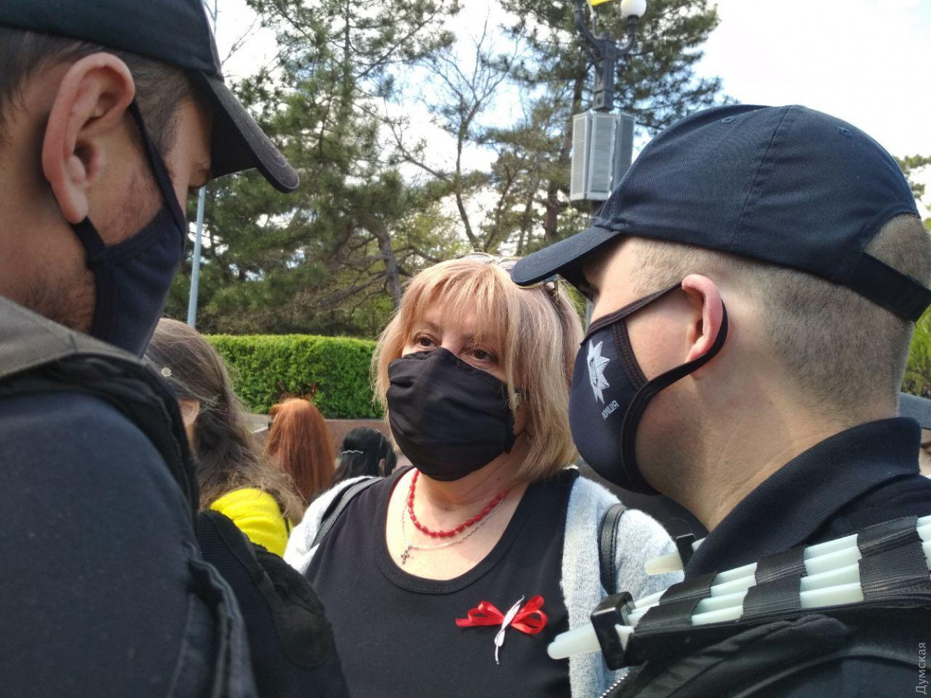 Вызывающе вели себя так называемые "куликовцы" - пророссийски и просоветски настроенные граждане. Возложив цветы к памятнику Неизвестному матросу, они не расходились, несмотря на требования полиции. Полицейские предупреждали о необходимости соблюдать правила карантина, но собравшиеся их игнорировали.