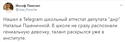 "Нашел в Telegram школьный аттестат депутата "ДНР" Натальи Пшеничной. В школе не сразу распознали гениальную девочку, талант раскрылся уже в институте", - написал автор публикации.