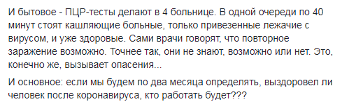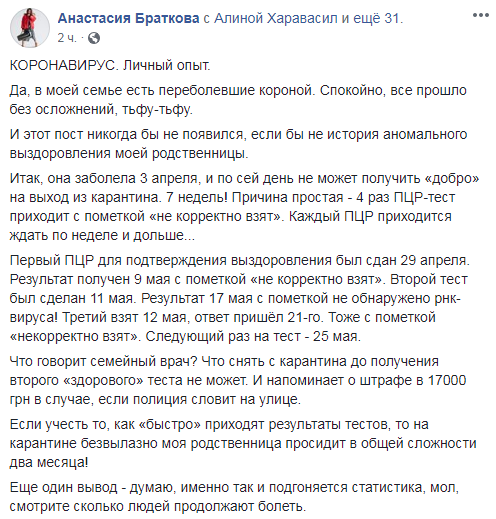 Она отметила, что ее родственница заболела COVID-19 еще 3 апреля. Однако до сегодняшнего дня ей запрещают выходить из карантина, а прошло уже 7 недель. Причина таких действий - тестирование.