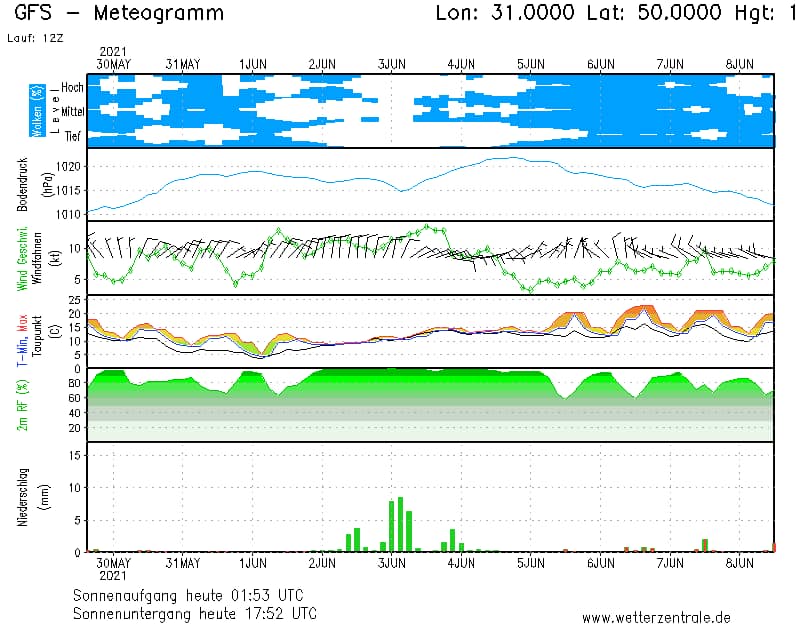 В частности, она опубликовала график, на котором видно, что 1 июня минимальная температура в Украине составит +5 градусов, а днем ожидается до +13 .. +15 градусов.