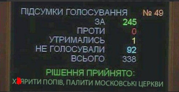 Еще одна фотожаба имитирует голосование Верховной Рады, где 245 депутатов якобы поддержали закон "х*ярити попів, палити московські церкви", один удержался, еще 92 не голосовали.