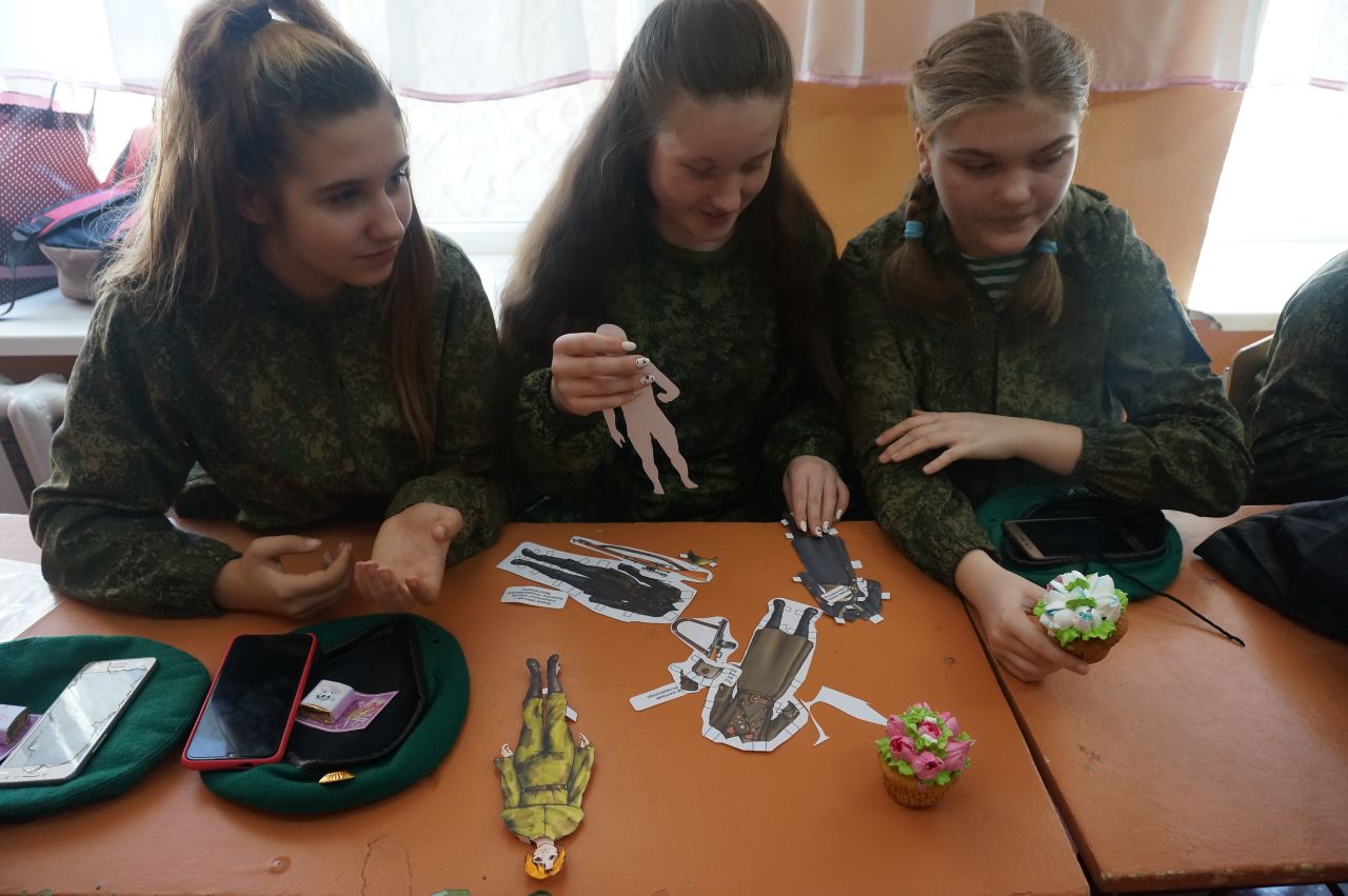На некоторых видно, как девочки играют в странную игру, примеряя наряды милитаристического стиля на бумажных кукол.
