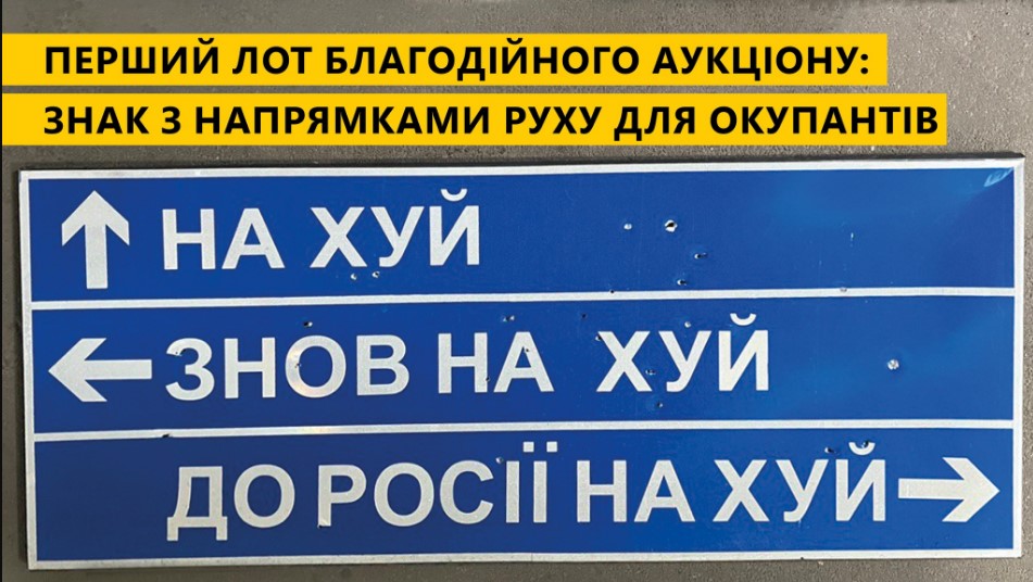 "Укравтодор" продал на благотворительном аукционе дорожный указатель "На х*й, снова на х*й, в Россию – на х*й", который был установлен на третий день войны в Сумской области, за 631 тысячу гривен.