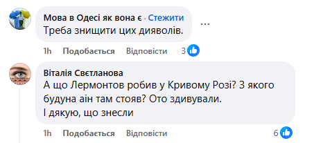 "А что Лермонтов делал в Кривом Роге? С какого будуна он там стоял? Вот удивили. И спасибо, что снесли".