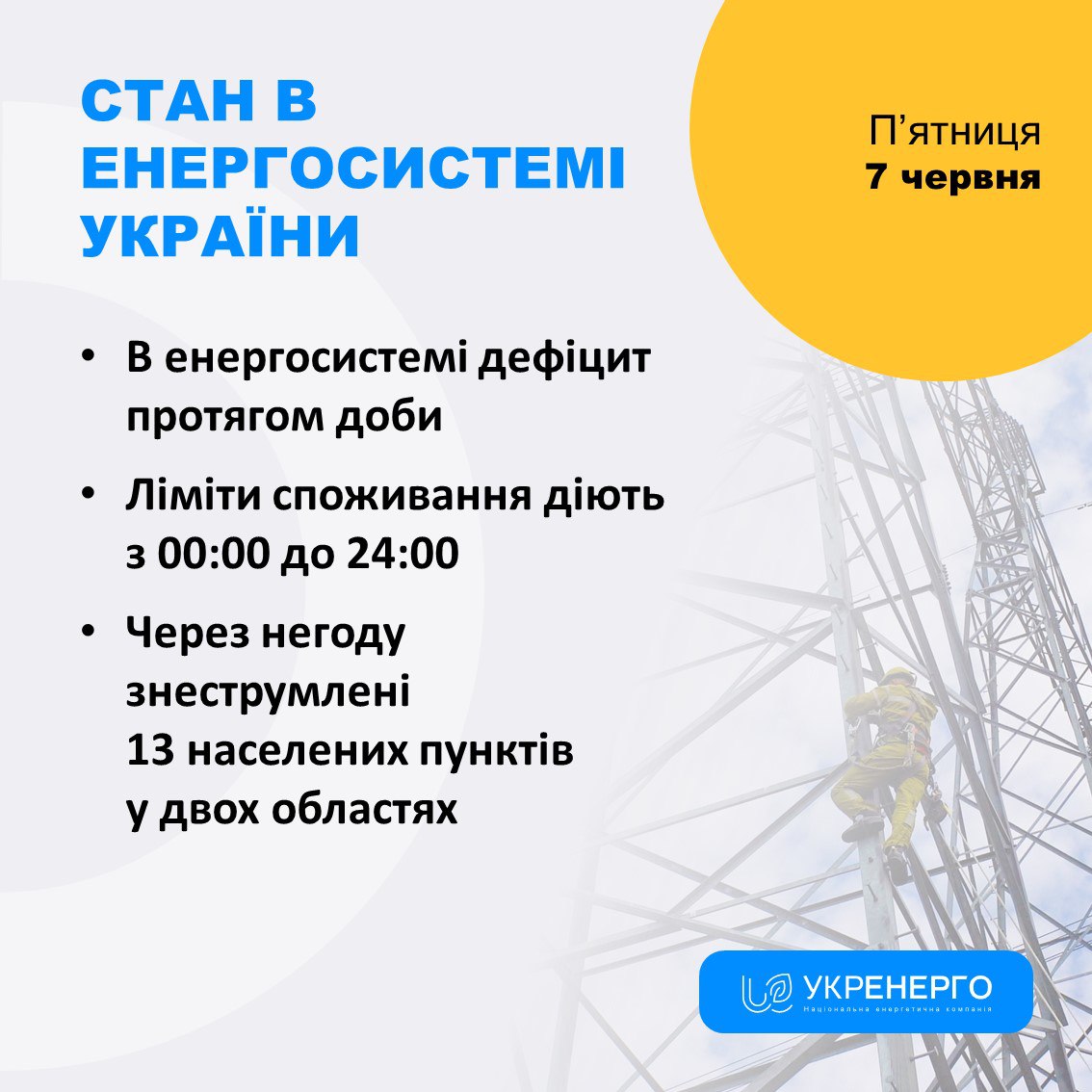 Планы отключения электроэнергии в пятницу, 7 июня, предполагают внедрение лимитов потребления в течение всего дня.