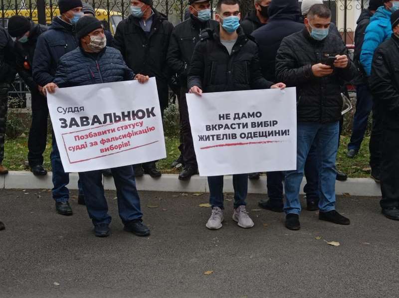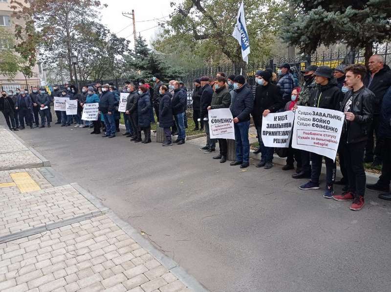 С плакатами "Не дадим украсть выбор жителей Одесчины" и "Лишить статуса судьи за фальсификации", митингующие требовали справедливого рассмотрения апелляционной жалобы на решение Одесского окружного админсуда.
