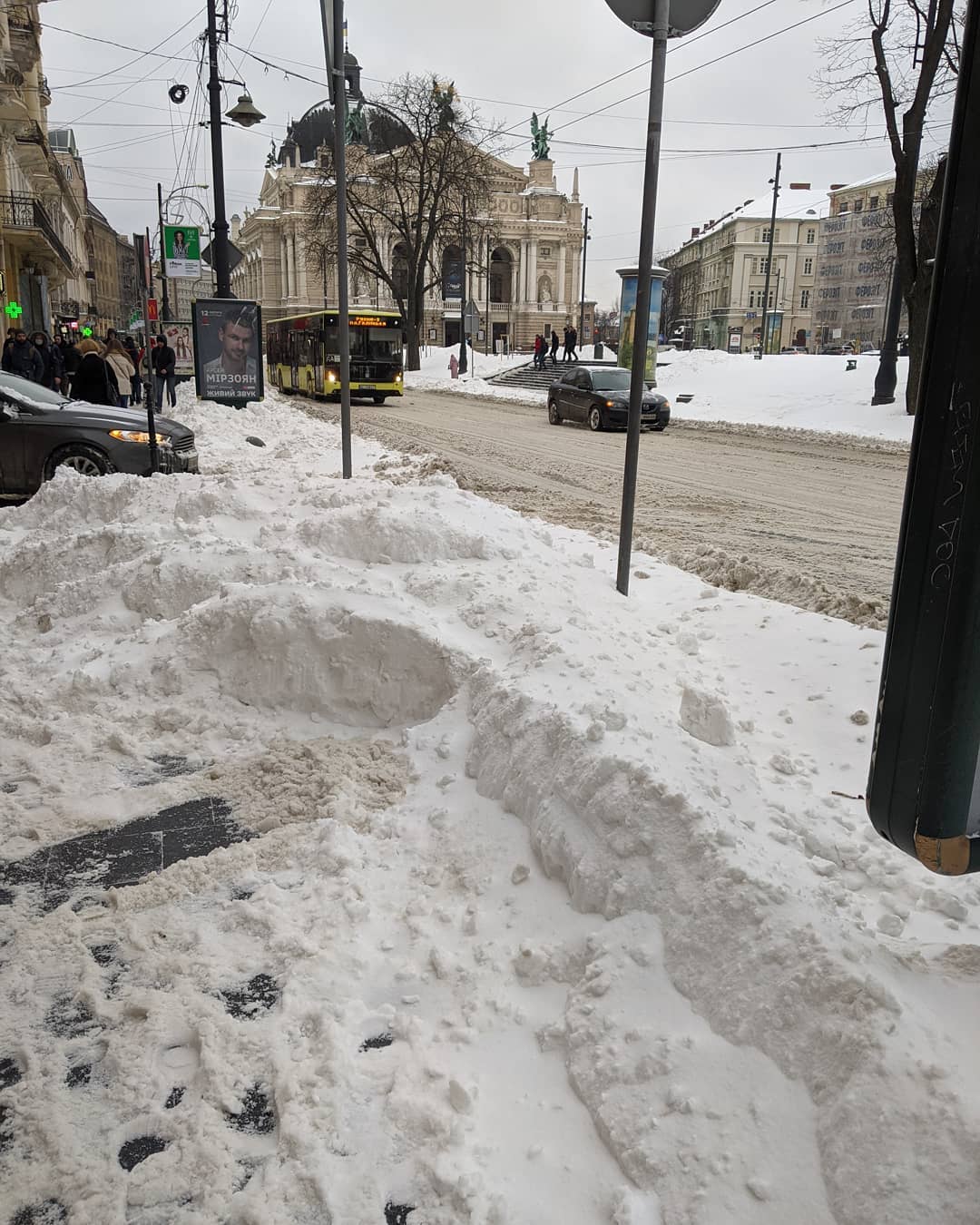 После продолжительных и обильных снегопадов, которые принес в Украину циклон, на улицах Львова образовались огромные сугробы, под некоторыми из них оказались припаркованные на обочинах автомобили.