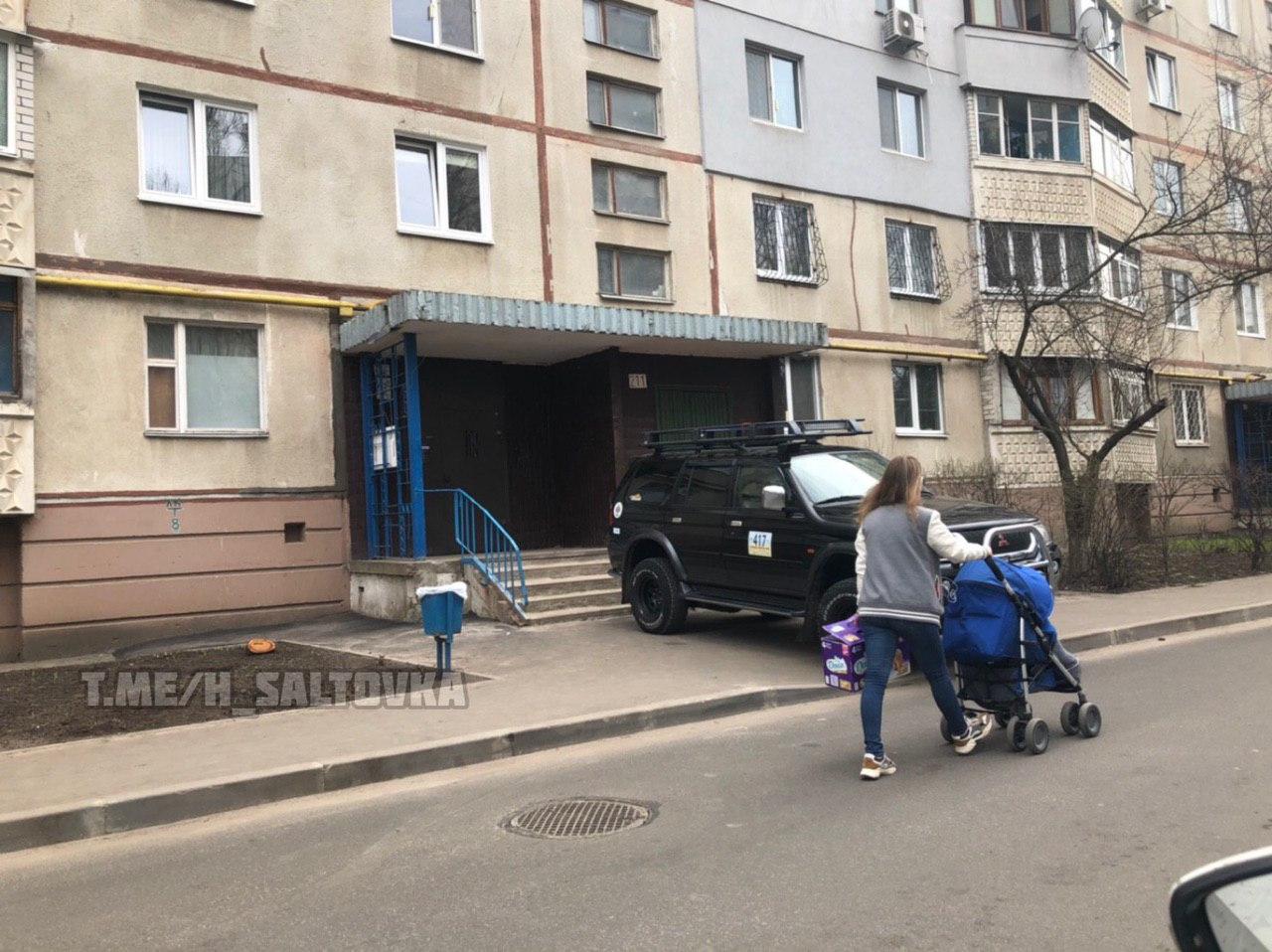 Водитель оставил автомобиль не просто на тротуаре, а рядом со ступеньками входа в подьезд и ушел по своим делам.