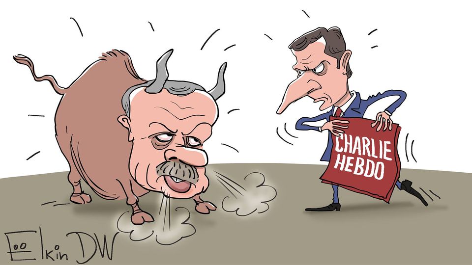 В частности, он показал напряженные отношения между президентами. Макрона он изобразил в виде тореадора, а Эрдогана - в виде разъяренного быка, который реагирует на табличку с названием скандального журнала.