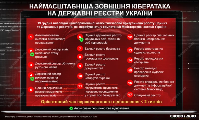 Теперь перед специалистами стоит задача восстановить реестры и их функционирование как можно скорее. По словам министерки юстиции Ольги Стефанишиной, в первую очередь возобновят работу Единого реестра доверенностей, Единого реестра специальных бланков нотариальных документов и Наследственного реестра.