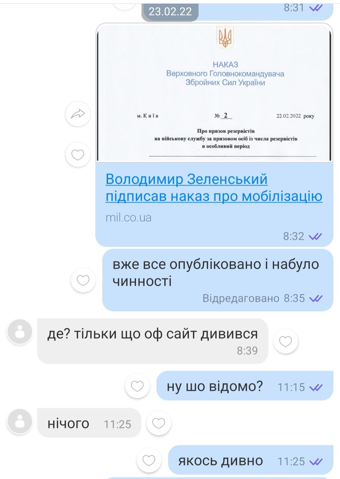 Она вспоминает: "Скрины не горят... Отмотала переписку с Андреем назад. Я увидела этот приказ в сети утром 23 февраля, даже раньше, чем он".