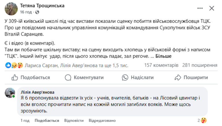 "Я бы предлагала отвезти их всех - учеников, учителей, родителей - на Лесное кладбище и всем вслух прочитать надпись на каждой могиле погибших воинов. Может что-то поймут", - написала Аверьянова под публикацией Трощинской относительно скандала.