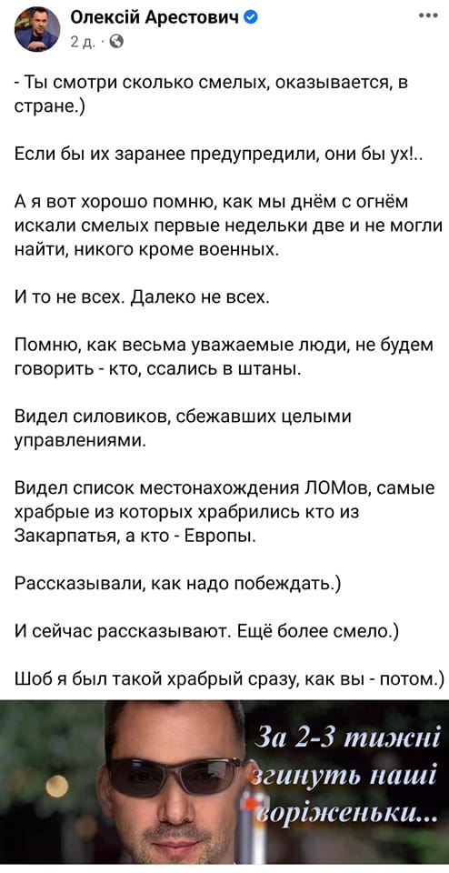 Так, комментируя новость о том, что глава государства заранее знал о том, что РФ нападет на Украину, Арестович написал, что в первые дни полномасштабной войны "днем с огнем искали смелых, но не могли найти никого, кроме военных". Этот пост вызвал бурю возмущений и обсуждений в социальных сетях.