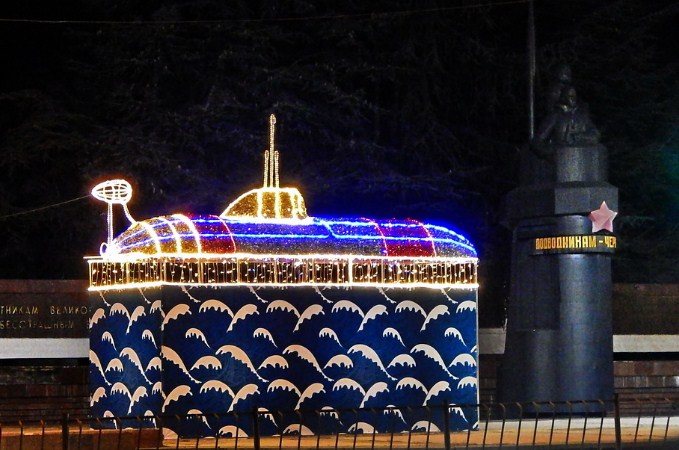 В оккупированном Россией Крыму, в городе Севастополь установили конструкцию с иллюминацией в виде подводной лодки.