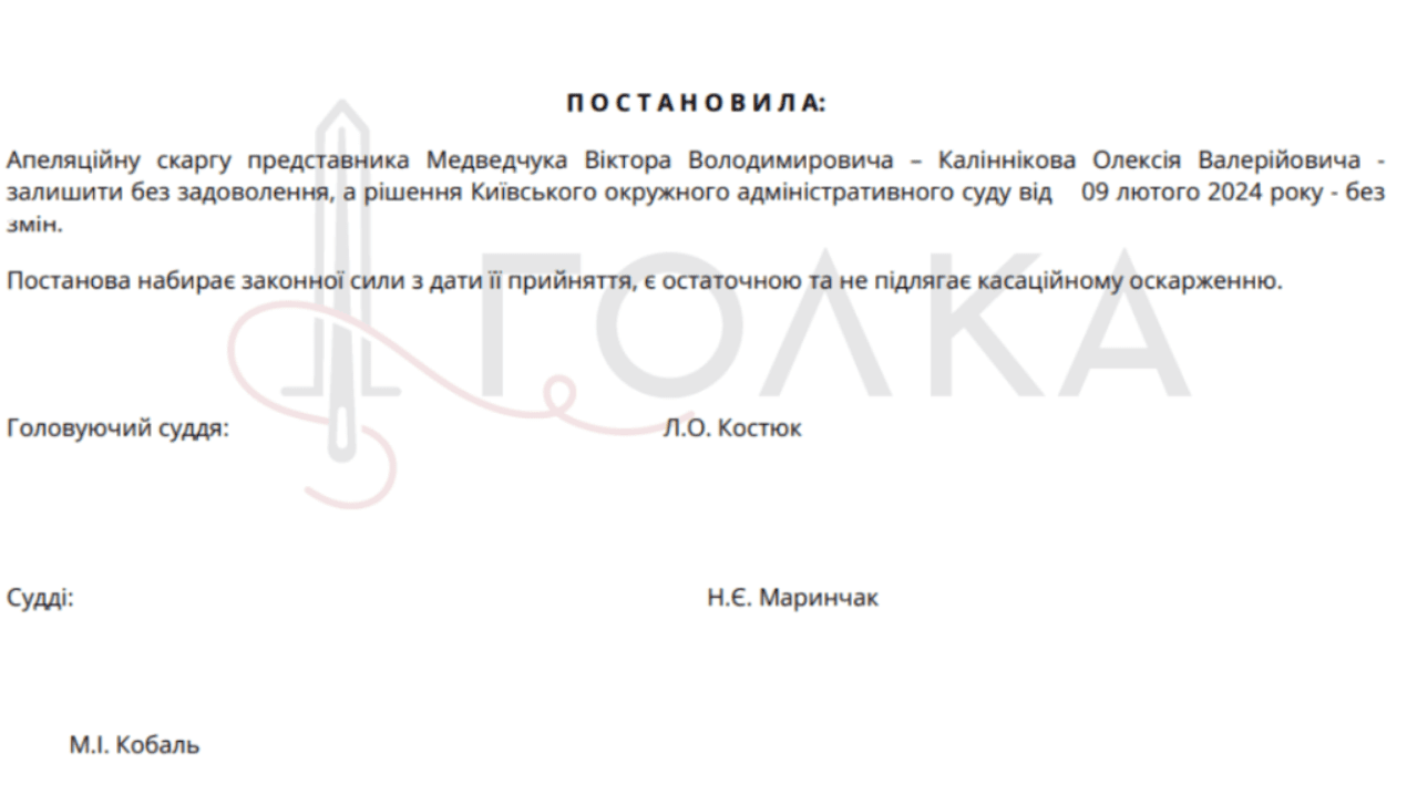 Поэтому окончательное решение суда оставило без удовлетворения апелляционную жалобу представителя Медведчука, а само решение Киевского окружного административного суда от 9 февраля 2024 года не меняли.