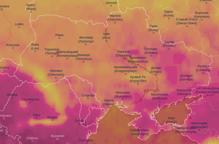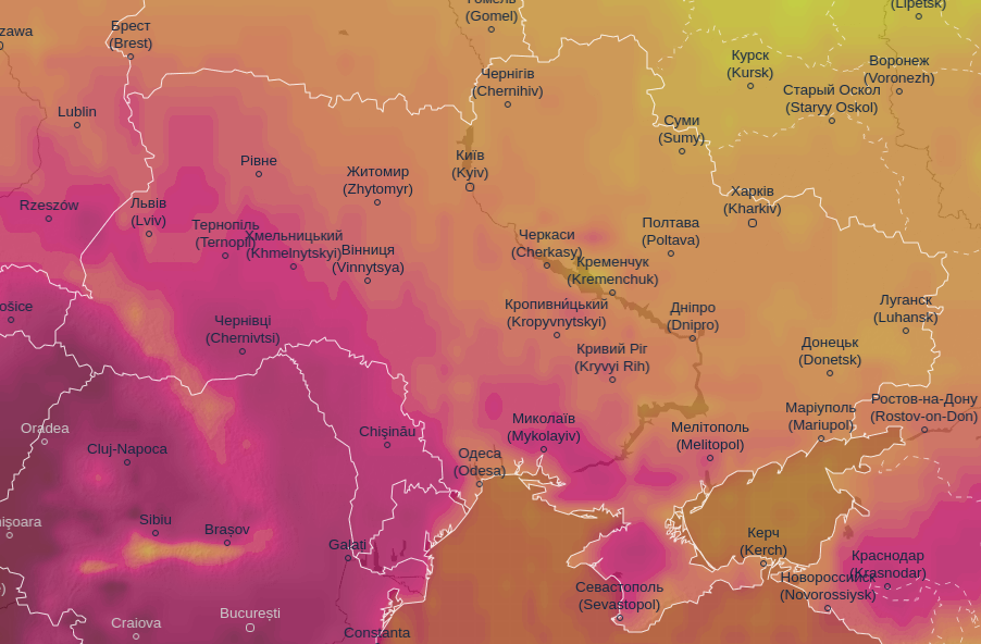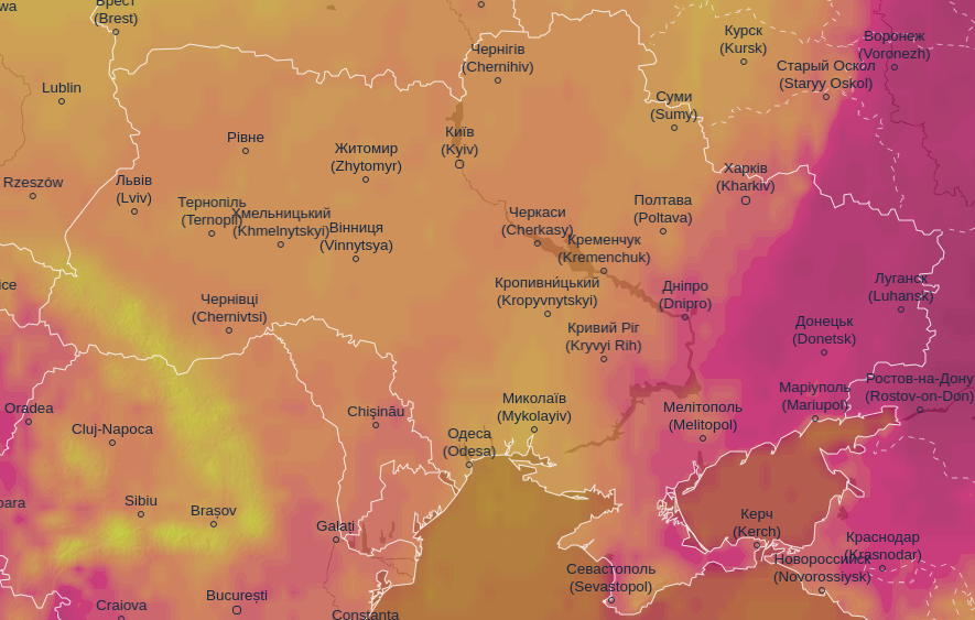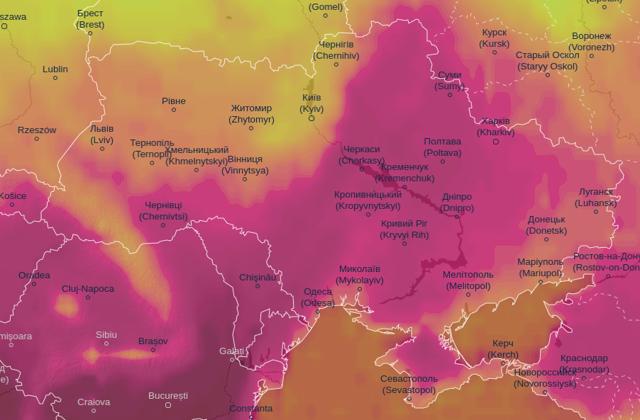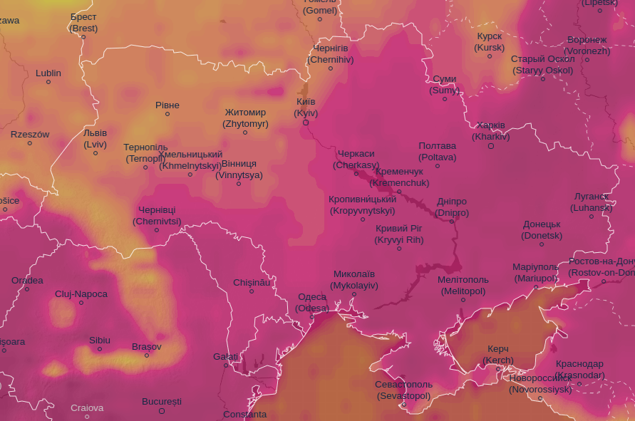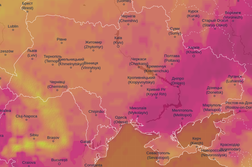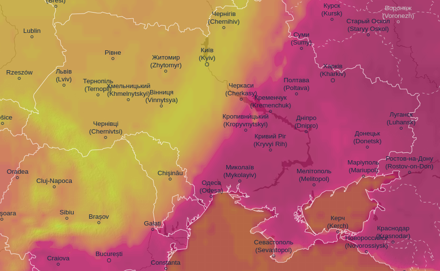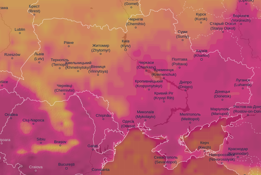 В среду, 18 августа, Украина разделится на две зоны - африканской жары и прохлады. Если разделить карту страны проведя линию от точки немного западнее Сум через Черкассы до точки западнее Одессы, то вся территория на западе от линии окажется во власти прохлады от +14 до +20 градусов. В то же время регионы, которые на карте окрашены фиолетовым цветом, будут изнемогать от зноя до +34 градусов.