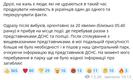 "Сразу после взрывов, ориентировочно через 20 минут (около 05:40 утра) я прибыл на место происшествия, где находился вместе с представителями ГСЧС и полиции. После общения с вышеуказанными представителями, в моем дальнейшем присутствии больше не было необходимости и я пошел в наш Центральный парк, ожидая информацию от представителей ГСЧС", – оправдался мэр.
