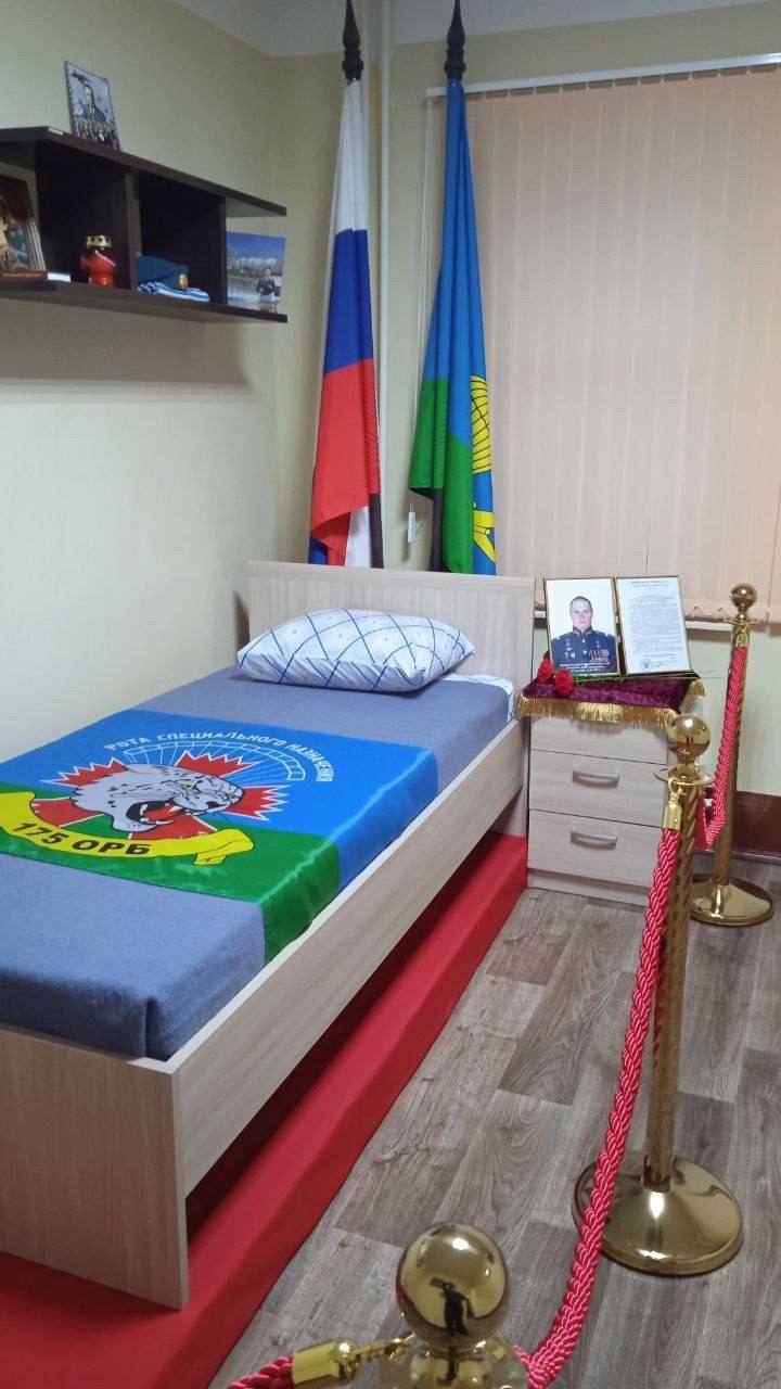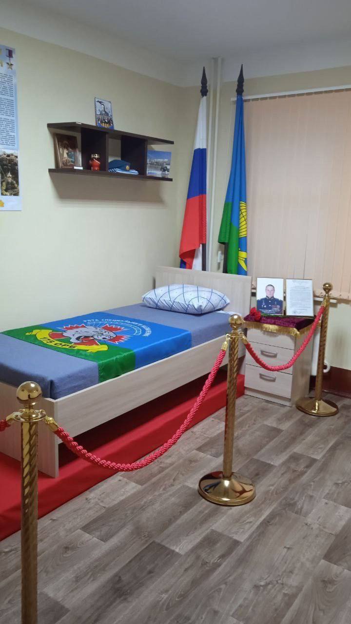 На кадрах – празднично убранная кровать, огороженная, как на кладбище. Флаги и фото, по всей видимости, погибшего военного из командного состава.